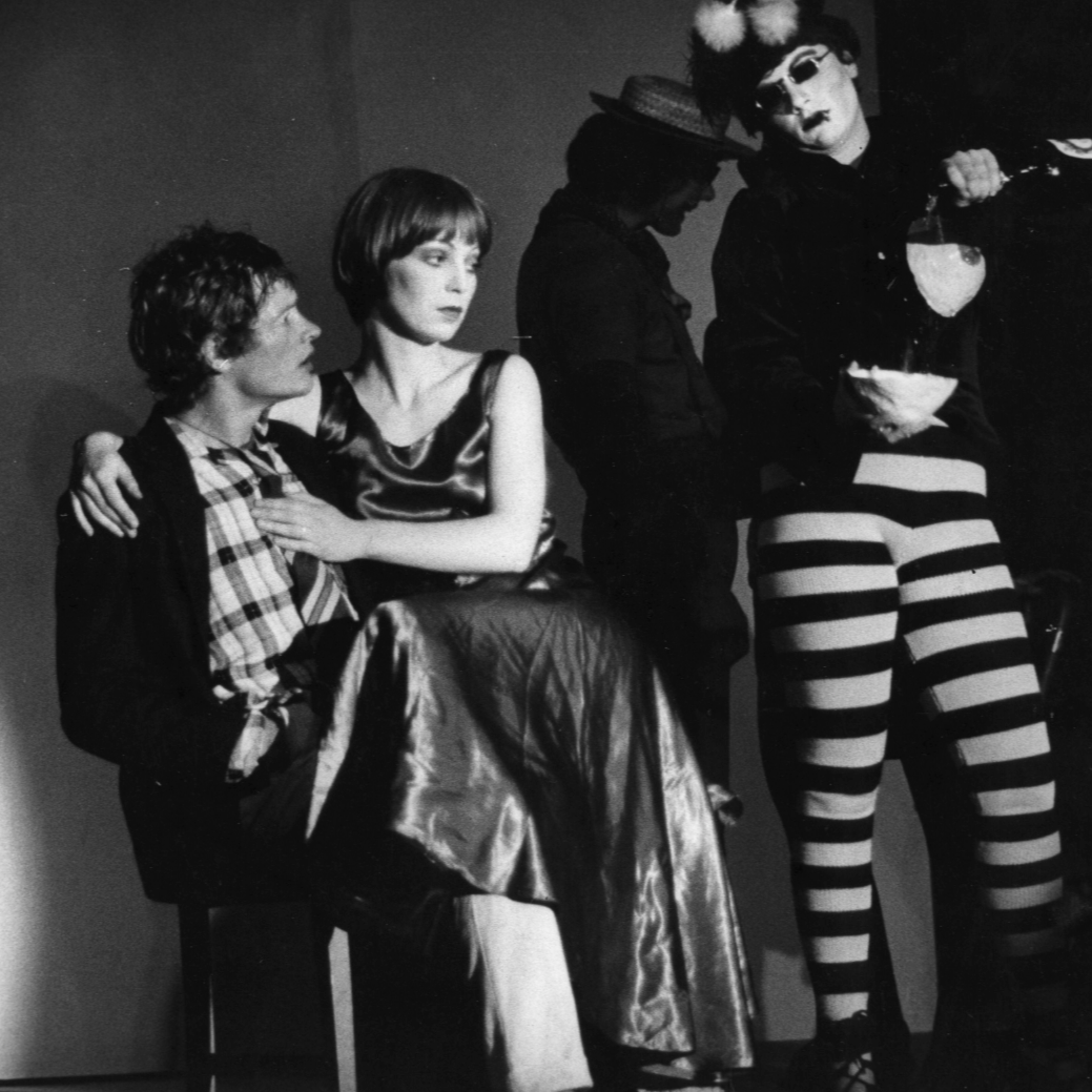 In the scene set at The Crazy Horse Saloon (infamous Parisian Nightclub) Deborah as waitress would pluck from her black velvet jacket a paper mache breast into which she would pour champagne. In this photo Helen Pankhurst, Deborah and Alan.